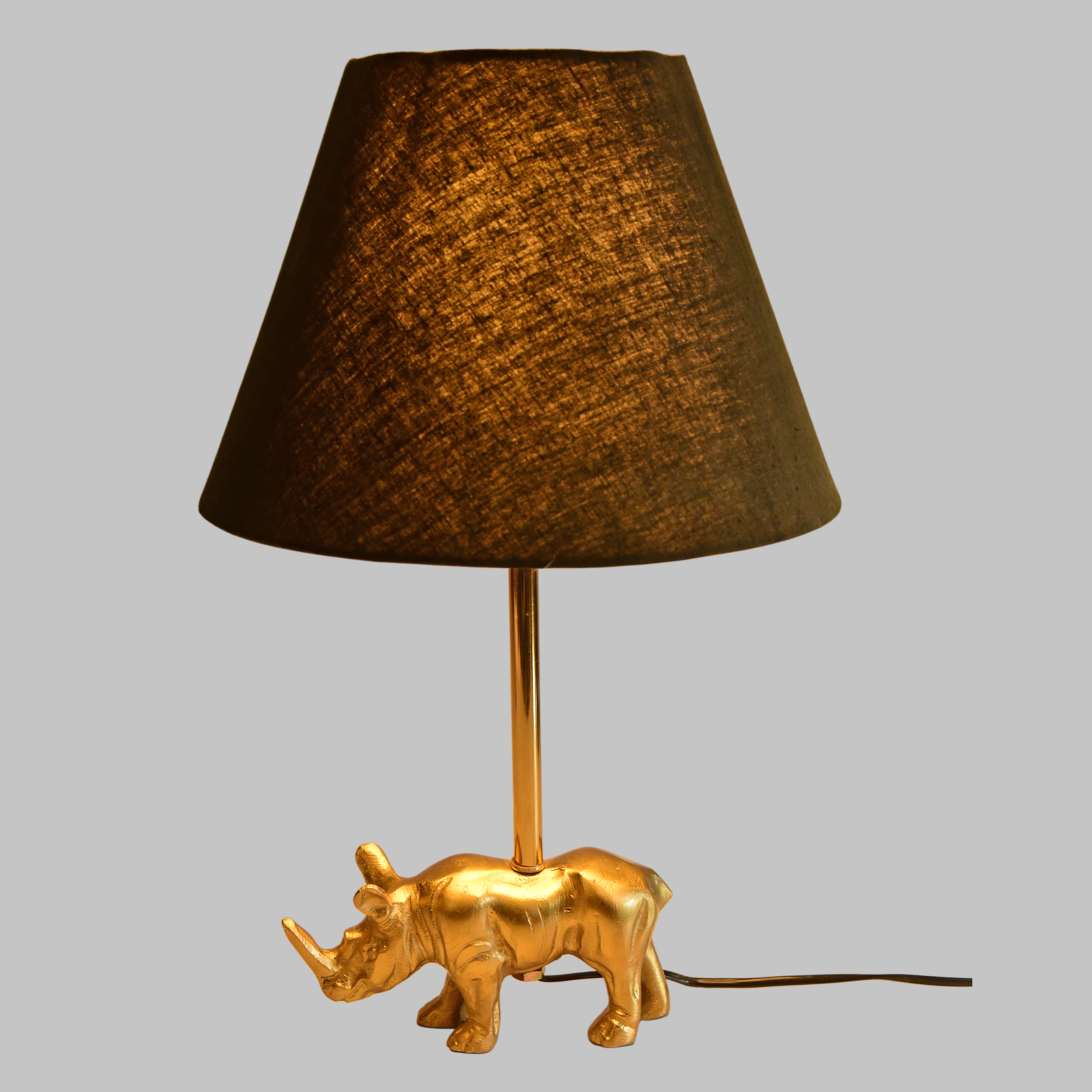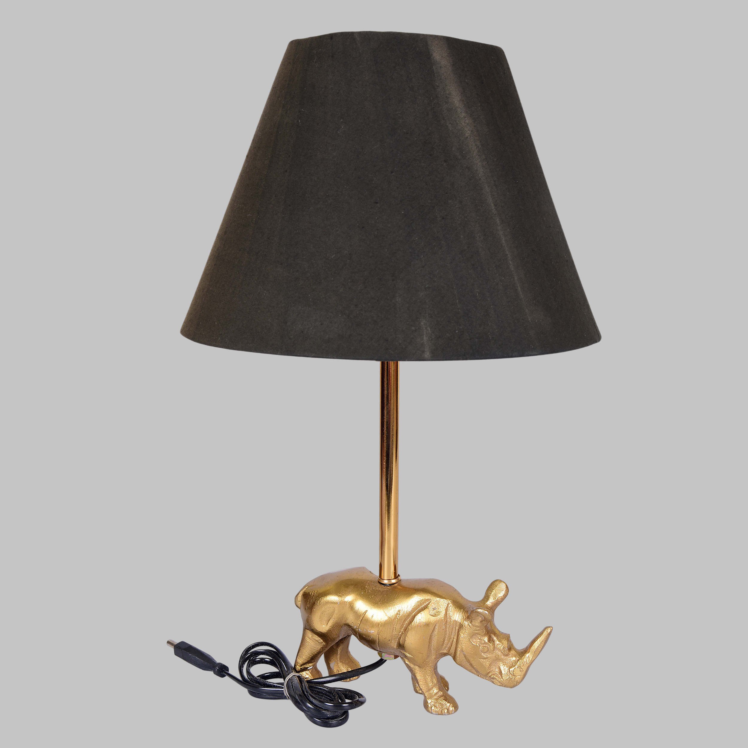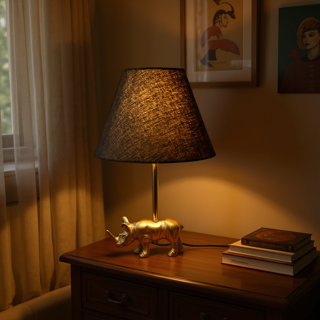 • Bring home elegance and style with this Luxury Golden Raihno Table Lamp. Crafted with a striking metallic golden cheetah base and adorned with crystal accents, this lamp comes with a premium black lampshade that complements modern and classic interiors alike. • Perfect for side tables, nightstands, and office desks, this lamp not only lights up your space but also serves as a statement décor piece. With its warm glow and artistic design, it’s also an excellent gift option for your loved ones. Material: Metallic alloy & fabric lampshade • Design: Golden cheetah base with crystal detailing & black shade • Size: Medium (approx. 45X22 cm ) • Color: Golden base with black shade • Usage: Table lamp for living room, bedroom, office, side tables, decorative lighting